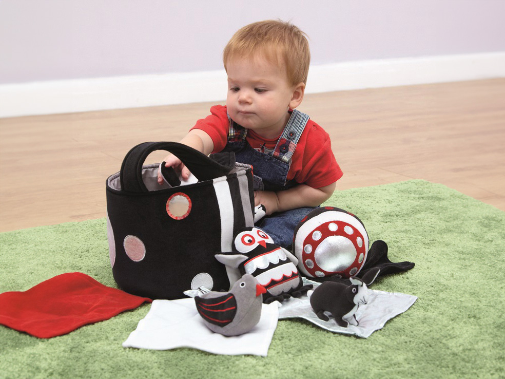 Cette belle et douce collection d'objets en velours vous invite à découvrir les différents objets avec tous vos sens: les animaux en noir et blanc contrastés se sentent différents ou émettent des sons.