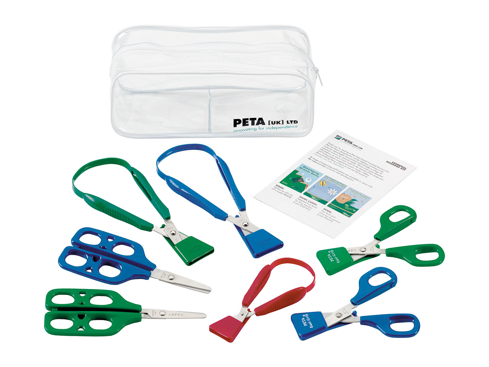Das Therapiescheren-Set enthält die meistverkauften Easi-Grip Scheren, die sich ideal für Kinder eignen, die Unterstützung bei der Entwicklung ihrer Scherenfähigkeiten benötigen. Das Kit wird in einer A5-Reissverschluss-PVC-Tasche geliefert und enthält 7 Scheren, gegebenenfalls auch für die linke Hand. Anleitungen sind ebenfalls enthalten.