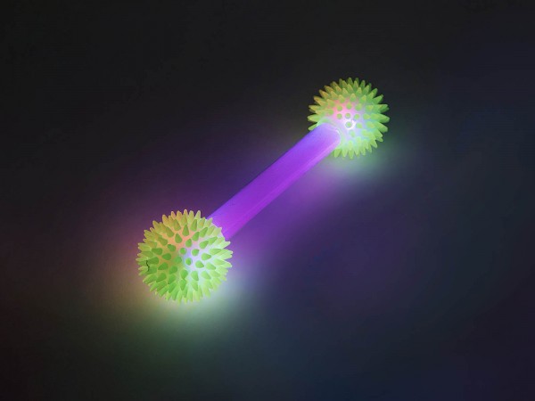 Si l'on touche l'une des boules légèrement épineuses en caoutchouc souple mais robuste, le bâton se met à clignoter pendant environ 10 à 15 secondes avant de s'éteindre automatiquement. Une expérience pour les sens ! Le bâton lumineux Duo-Spikey est d'environ 43 cm de longeure.