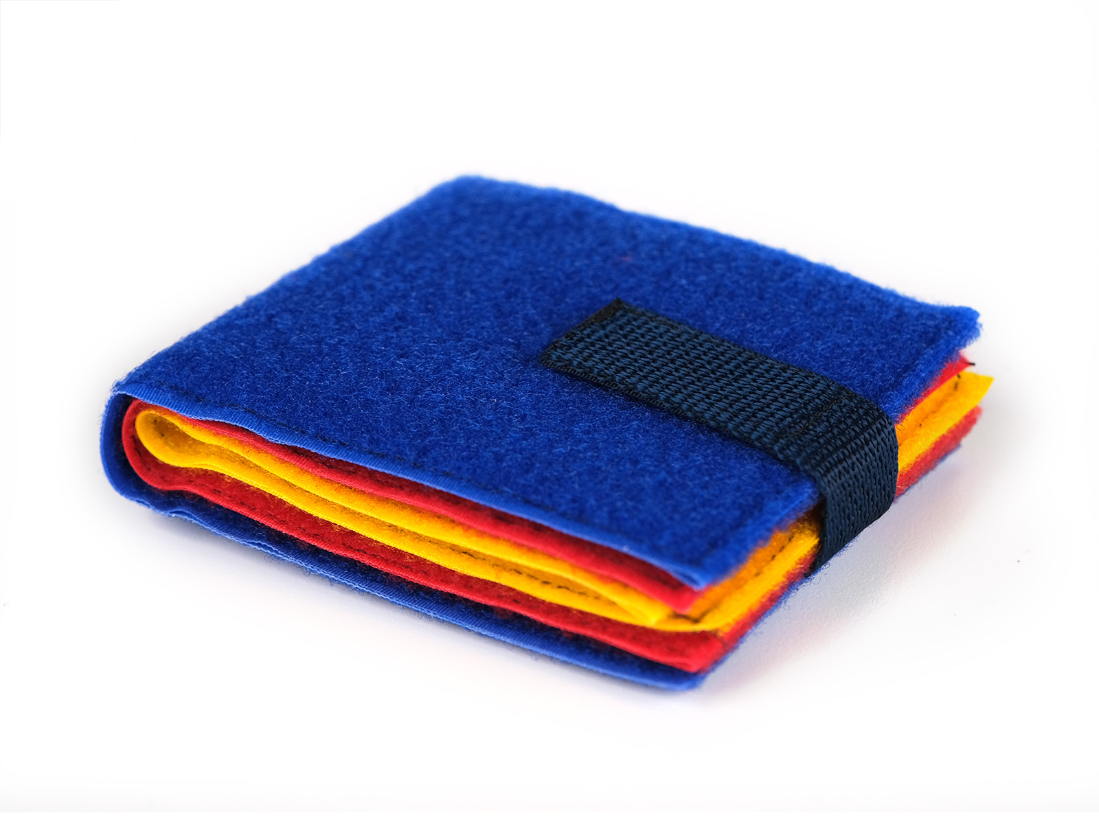 Le répertoire pliable est doté d'une large bande de velcro sur laquelle les symboles peuvent être fixés à l'aide de velcro.