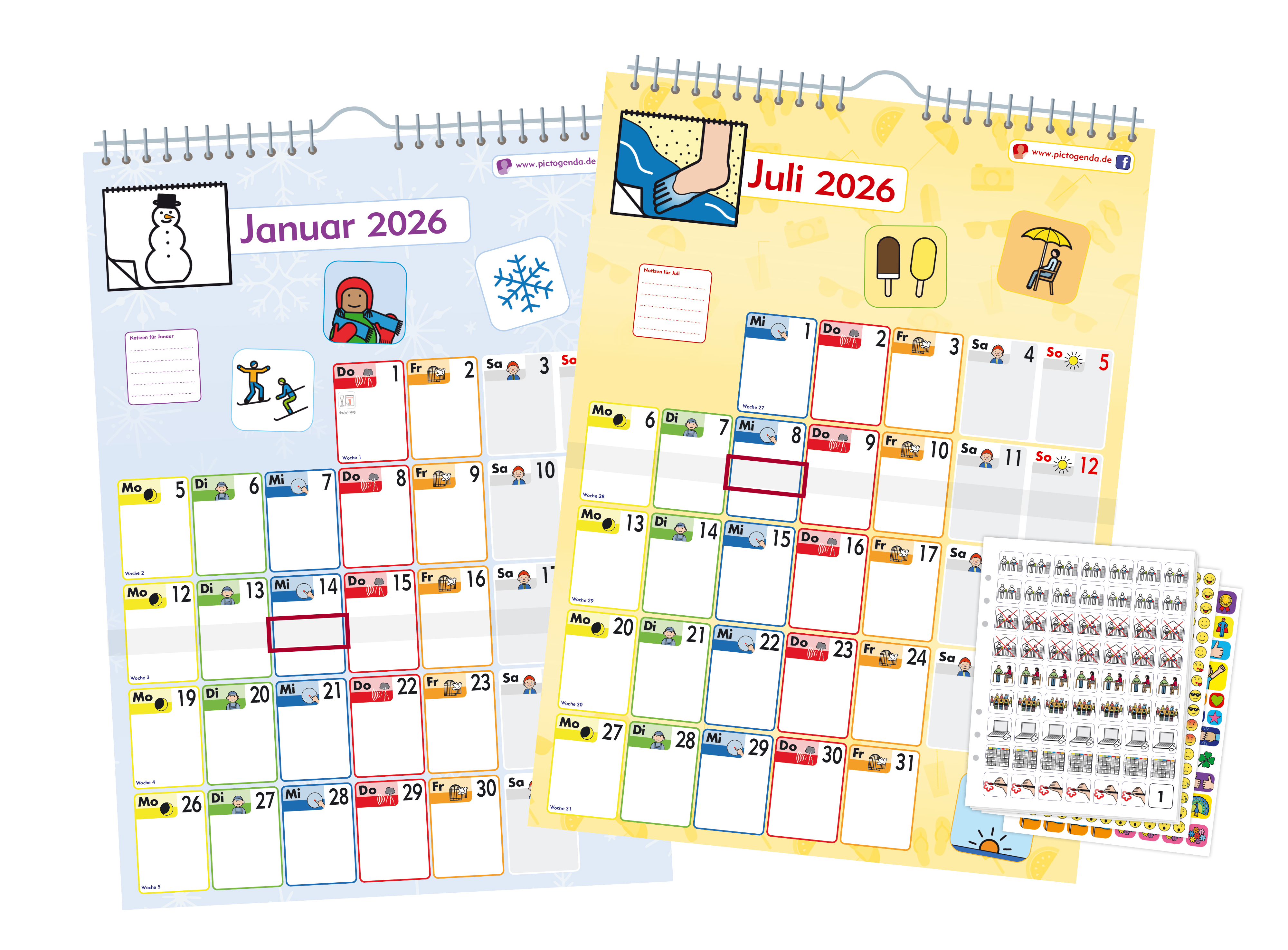 Grâce aux autocollants pictogrammes, émoticônes et compliments inclus, il est facile de marquer les événements et les activités. Chaque jour de la semaine possède une couleur fixe et un symbole, et les jours fériés sont déjà indiqués.