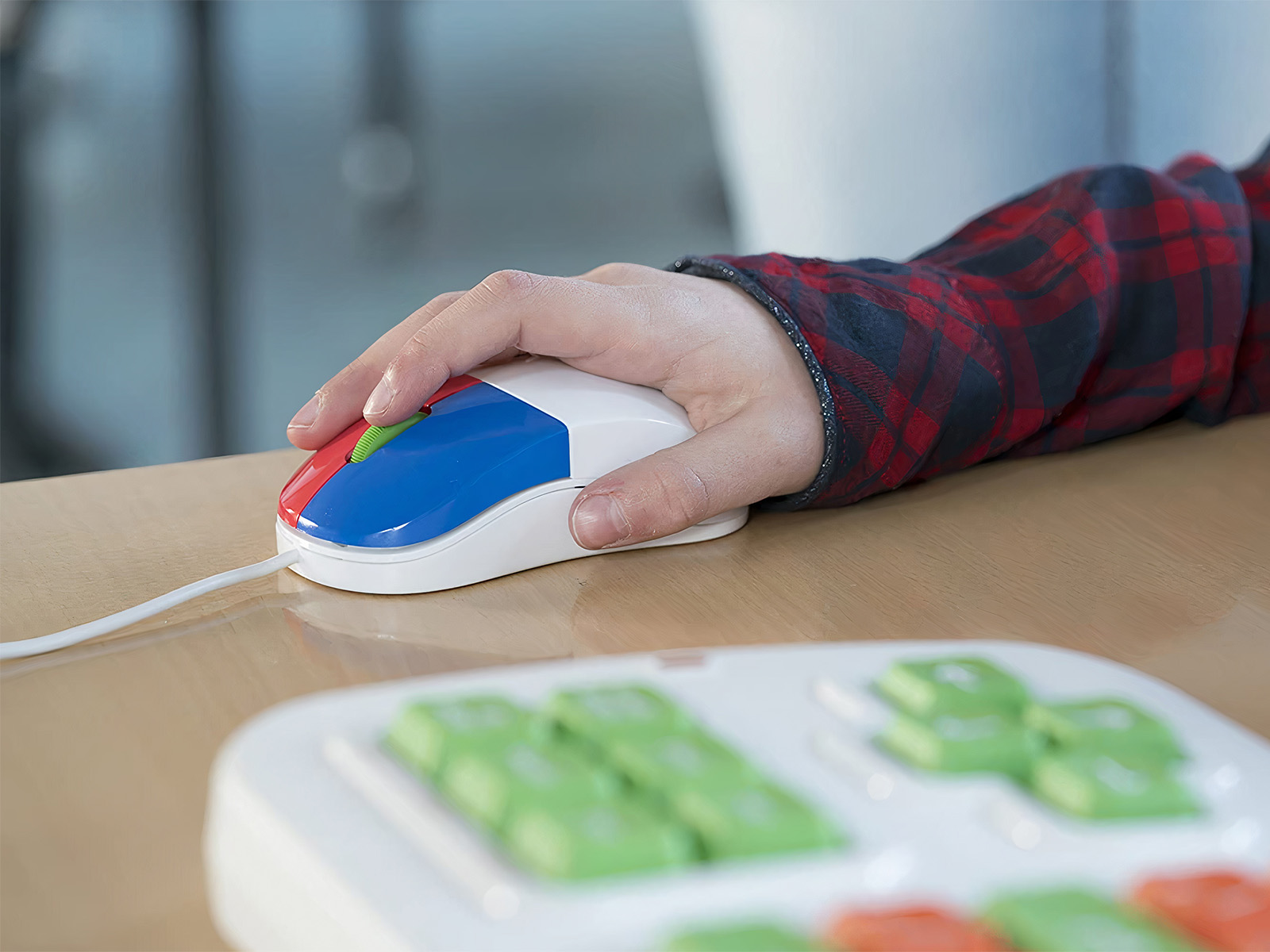 Die beiden Maustasten sind durch kontrastierende Farben deutlich unterscheidbar. So können Kinder leicht erkennen, welche Maustaste welche ist: Die rechte Maustaste ist rot, die linke Taste ist blau und das Scrollrad ist grün. Das farbenfrohe Design sorgt dafür, dass der Umgang mit der Computermaus weniger einschüchternd ist und den Schülern sogar Spass macht!
