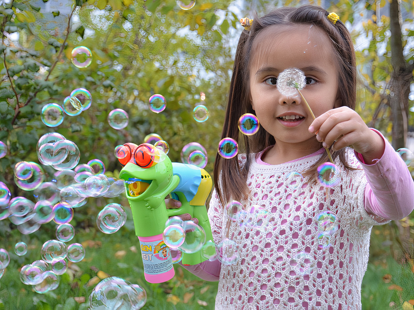 Die Froggy Pistole erzeugt nicht nur eine Menge Seifenblasen, sondern spielt auch Musik und beleuchtet mit den eingebauten LEDs die versprühten Seifenblasen.